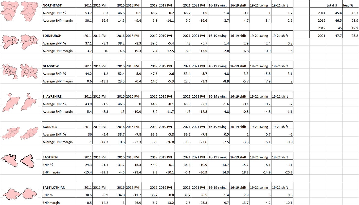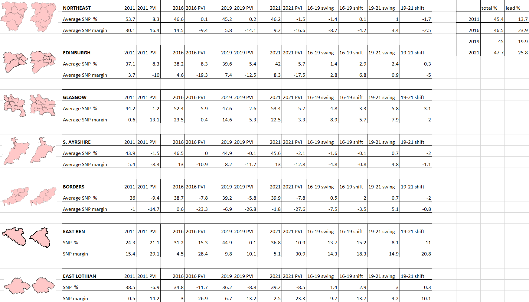“Here’s something to chew on. At the 2016 Holyrood election, the SNP won 46.5% of the popular vote, with which it managed to hold a lead of 23 points over the Tories in Banffshire & Buchan Coast and 9 points in Moray, but lose Eastwood by 4.5 points. Three years later at the 2019 General Election, the SNP won exactly 45% of the vote, with which it managed to win the latter’s coterminous constituency of East Renfrewshire with a margin of nearly 10 points, but lost the former equivalent constituency of Banff & Buchan by 10 points, and lost Moray by a single point. What this neatly demonstrates is that under the hood of fairly steady nationwide support for the SNP, drastic shifts have been taking place within the geographic coalition of the party. Its fortunes have blossomed in affluent suburban and strongly “Remain” voting areas, while falling back significantly in rural and/or coastal Eurosceptic regions.”